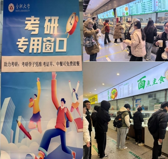學校全力為考生提供暖心后勤保障服務(wù),食堂開設(shè)考研專用窗口,考試期間免費供應(yīng)一日三餐及暖心姜湯,提供營養(yǎng)均衡、種類豐富的菜品,贈送“考研助力包”,為考研學子加油鼓勁。
