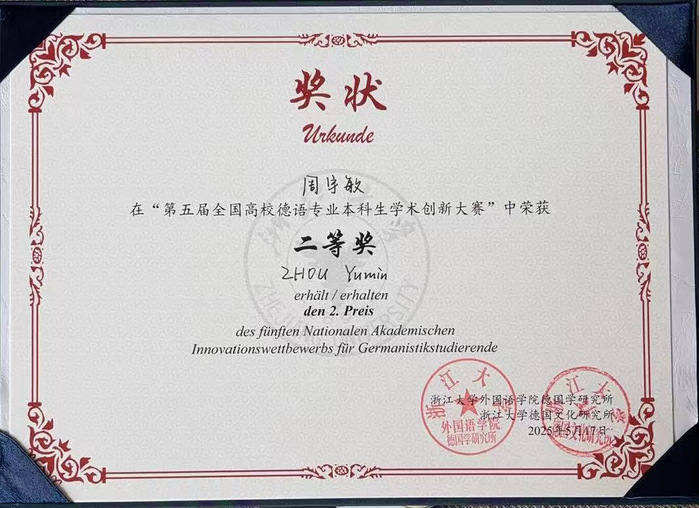 5月18日,第五屆全國高校德語專業本科生學術創新大賽全國總決賽在浙江大學圓滿落幕。我校外國語學院2021級德語專業學生周宇敏的作品《跨區+跨境電商背景下中國農產品外宣德譯策略研究》榮獲全國二等獎。指導老師朱越榮獲“優秀指導教師”稱號。