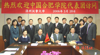 2006年5月27日――6月2日院長趙良慶教授率領我院代表團一行8人對韓國漢拿大學、順天香大學、韓南大學、韓瑞大學和漢城大學等5所大學分別進行了友好訪問。訪問期間,漢拿大學校長金星勛博士、順天香大學校長徐教博士、韓南大學校長李相潤博士、韓瑞大學校長咸基善博士和漢城大學校長尹慶老博士均給予我院代表團以最高禮遇,并積極表達了與我院開展多方面、多領域、多層次合作的強烈愿望。