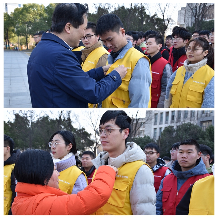活動(dòng)中,在場(chǎng)老黨員重溫入黨誓詞、新黨員進(jìn)行入黨宣誓,由學(xué)院黨委副書(shū)記、院長(zhǎng)呂剛領(lǐng)誓。凜冽寒風(fēng)中,大家面向黨旗莊嚴(yán)宣誓,錚錚誓言,振聾發(fā)聵,表達(dá)了黨員們?yōu)楣伯a(chǎn)主義事業(yè)奮斗終身的堅(jiān)定決心。宣誓結(jié)束后,學(xué)院黨委委員分別為各學(xué)生支部新發(fā)展學(xué)生黨員代表佩戴黨徽,各位老師現(xiàn)場(chǎng)勉勵(lì)新黨員們?cè)谒枷肷闲袆?dòng)上更加嚴(yán)格自我要求,積極向老黨員學(xué)習(xí),以實(shí)際行動(dòng)踐行入黨誓詞,不斷提高思想覺(jué)悟,做一名優(yōu)秀的共產(chǎn)黨員。