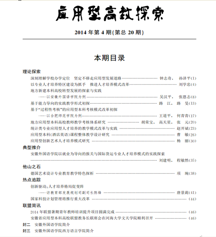 《應用型高教探索》2014年第 4 期(總第20期)已編發,具體內容請查閱發展規劃處網站http://www.yfzleon.xyz/s/85/t/330/p/6/list.htm