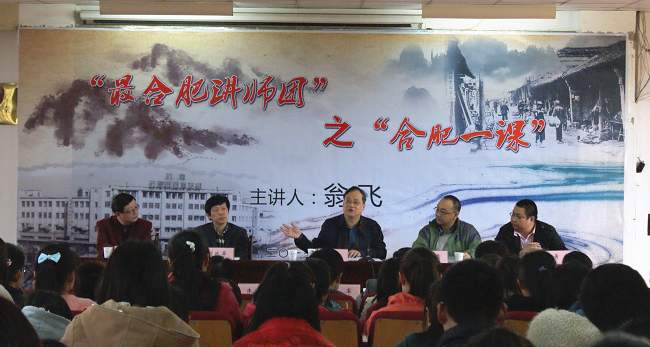 3月6日下午,由《合肥晚報》策劃并推出的“最合肥講師團” 首場報告會之“合肥一課”在合肥學院博學樓C座學術報告廳隆重舉行。講師團安徽省社科聯歷史文化中心主任翁飛,安徽省大別山研究院研究員鮑雷,著名作家、合肥方言研究者劉政屏,城市地理曁民風民俗獨立研究人蕭寒,“最合肥”周刊主筆、安徽省民俗學會副秘書長李云勝;合肥學院黨委委員、紀委書記洪家友,《合肥晚報》總編輯陳軍,副總編輯朱曉凱,文體中心主任王暉,副刊部主任石紅彥,中文系主任詹向紅,系副主任丁增武,系學術委員會主任朱育穎出席報告會。本場報告會由翁飛博士主講。宣傳部部長白義香主持報告會。我院120余名學生到場聆聽。