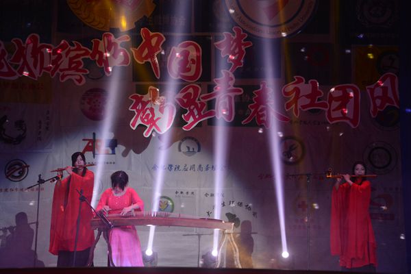 聚光燈重新轉回舞臺中央,只見兩名紅衣女子持竹笛緩緩走出,伴著優(yōu)雅的古箏音,一曲《雨碎江南》將觀眾帶入了另一個古香古色的世界。閉幕式最后一個板塊“文化根藝術魂 禮敬中國夢”也就此開始。節(jié)奏感十足、技藝高超的B-BOX表演用嘴巴發(fā)出十余種不同樂器的聲音,婉轉華美的戲曲表演《天女散花》,靈動耐聽的中英日韓四國歌曲串燒引得全場歡呼不斷、掌聲連連。由漢宣社帶來的舞蹈情景劇表演《洛神賦》,圣潔飄逸的舞姿加之耐人尋味的劇情,讓觀眾們感受到了不一樣的歷史之風,也為此次晚會畫上了一個圓滿的句號。