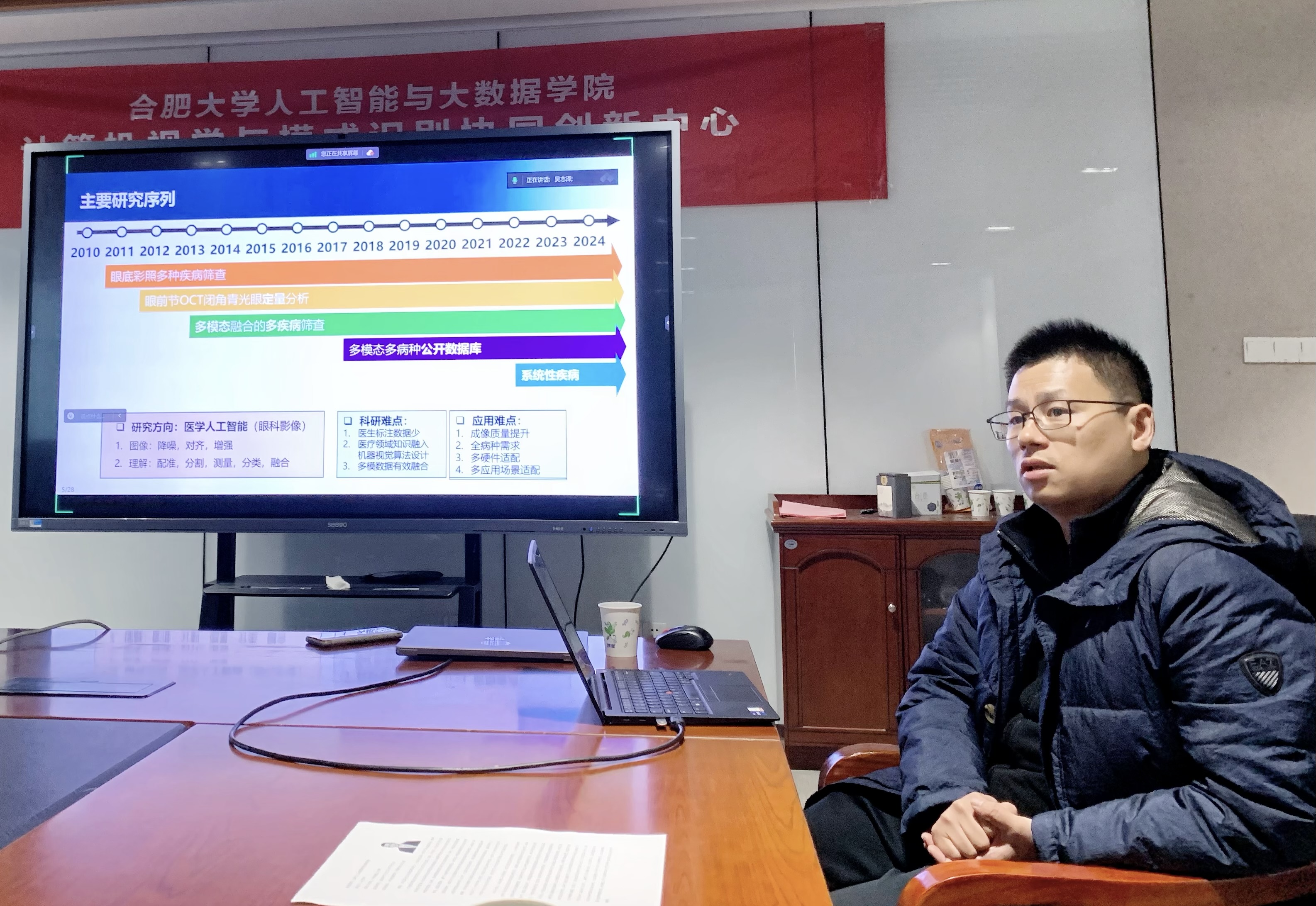 2月21日下午,應合肥大學計算機視覺與模式識別協同創新中心邀請,華南理工大學長聘教授、新加坡眼科研究所客聘教授、人工智能與數字經濟廣東省實驗室研究員、博士生導師許言午教授在合肥大學中德教育合作示范基地7棟501會議室作了題為“基于人工智能的青光眼篩查”的學術報告。本場報告由合肥大學教務處處長、計算機視覺與模式識別協同創新中心主任王曉峰教授主持。