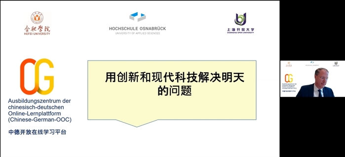 Im Namen des Bildungsministeriums der Provinz Anhui gratuliert  Zhang Geng zur Unterzeichnung der drei Hochschulen. Er sagte, dass die Universit?t  Hefei und die Hochschule Osnabrück einen guten Kooperationsmechanismus des gegenseitigen Respekts, der gegenseitigen Unterstützung und des gegenseitigen Vertrauens in engem Austausch etabliert und eine gemeinsame berufliche Entwicklung, eine gemeinsame Ausbildung von Studierenden und einen gemeinsamen Versuchsaufbau realisiert h?tten. Er betonte, dass die Zusammenarbeit zwischen den drei Hochschulen  eine neue Erkundung und einen Fortschritt in der chinesisch-deutschen Zusammenarbeit und der integrierten Entwicklung des Jangtse-Deltas darstelle . Der Bau und die Aktivierung einer offenen Online-Lernplattform h?t ten eine Online-Freundschaftsbrücke und Autobahn für deutsch-chinesische Zusammenarbeit und Austausch errichtet. Es erschloss neue Bereiche und neue R?ume für die deutsch-chinesische Zusammenarbeit und den Austausch. Das Bildungsministerium der Provinz Anhui wird  weiterhin die Kooperationsprojekte der Universit?t Hefei und die Errichtung einer hochrangigen Universit?t  der  Universit?t Hefei unterstützen.