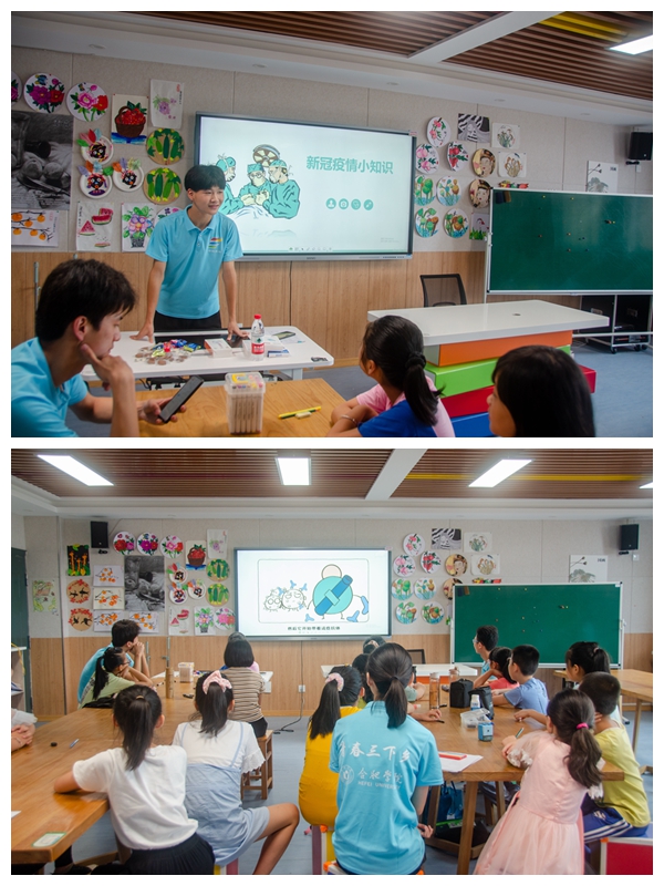 7月20日,實踐團隊前往嚴店鄉中心學校進行防疫宣講。成員們向小朋友們講解新冠肺炎的危害和防護知識,并播放鐘南山院士的紀錄片,讓小朋友們深入了解抗“疫”故事。