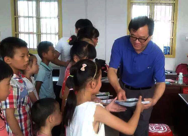 丁明為經濟系支教的小學生發(fā)放贈送的文具用品