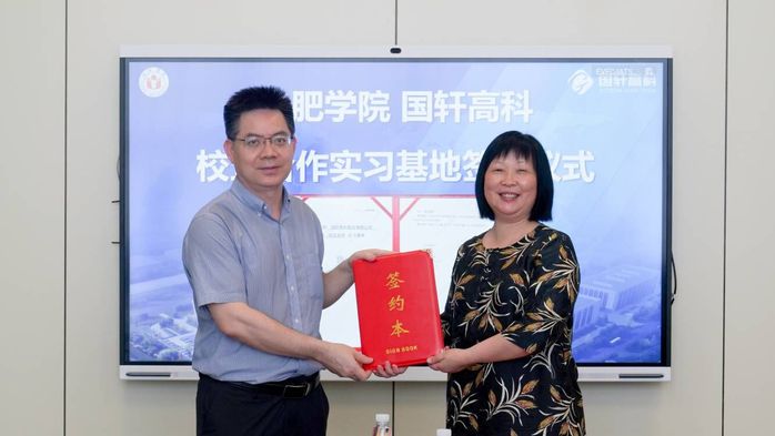 6月16日上午,合肥學(xué)院與國軒高科校企合作實(shí)習(xí)基地簽約暨揭牌儀式在國軒高科包河總部舉行。國軒高科副總裁王永海、人力資源中心總監(jiān)周祖寧、國軒學(xué)堂執(zhí)行校長陳雨、國軒學(xué)堂執(zhí)行副校長吳林、人力資源中心招聘經(jīng)理張守洪、國軒學(xué)堂培訓(xùn)經(jīng)理張東,我校黨委委員、學(xué)工部部長朱濤,科研處處長、服務(wù)地方辦公室主任汪潘義,教務(wù)處副處長王仁寶,國際交流合作處副處長方宗保,外國語學(xué)院黨委書記余勇、院長侯繼紅、德語系主任江紅、德語系教師朱俊俏、蔡欣怡以及德語系2018級4位實(shí)習(xí)生等參加儀式。