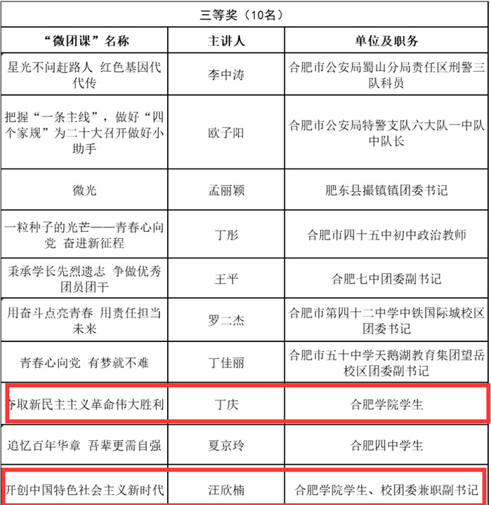 為迎接和學(xué)習(xí)宣傳貫徹黨的二十大,慶祝中國共產(chǎn)主義青年團成立100周年,激勵廣大團員青年砥礪前行、展示青春風(fēng)采,共青團合肥市委圍繞“喜迎二十大 永遠(yuǎn)跟黨走 奮進新征程”主題,組織開展了優(yōu)秀微團課評選活動。近日,評選結(jié)果公布,我校2件學(xué)生作品榮獲三等獎。