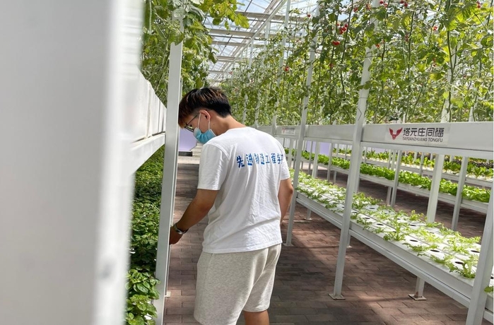 圖為調研人員正在塔元莊村“智慧農場”西紅柿區觀賞