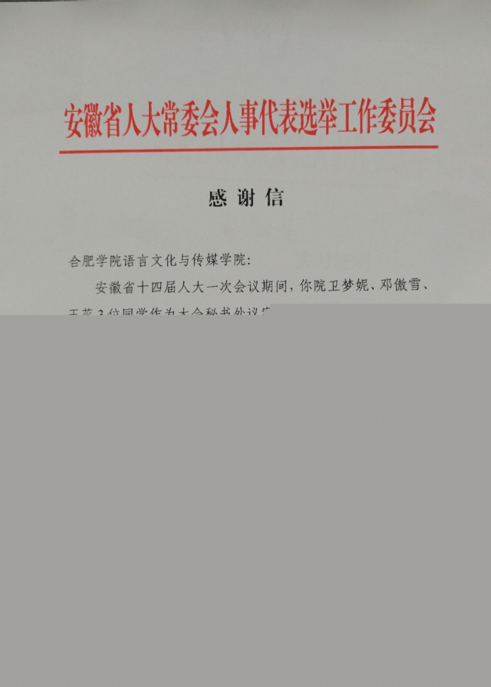 1月11日至17日,我校語言文化與傳媒學院的衛夢妮、鄧傲雪、王蕊三位同學圓滿完成安徽省第十四屆人民代表大會一次會議的實習任務,受到省人大領導的高度評價,并向我校發來感謝信。