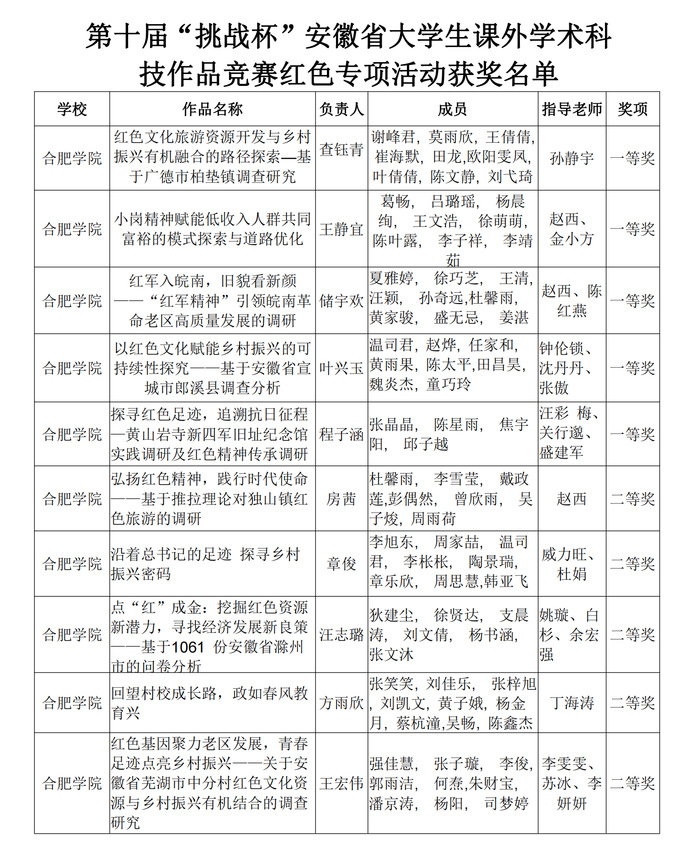 紅色專項活動是“挑戰杯”課外學術科技作品競賽的一個專項賽,旨在鼓勵團員青年以實踐活動為載體,通過紅色主題社會實踐和調查研究,創新實踐活動內容,切身感受新時代國家發展的偉大成就。校賽階段,我校共計收集作品29項,經評選,最終推薦12項作品參加省賽,其中《紅色文化旅游資源開發與鄉村振興有機融合的路徑探索—基于廣德市柏墊鎮調查研究》《小崗精神賦能低收入人群共同富裕的模式探索與道路優化》《紅軍入皖南,舊貌看新顏——“紅軍精神”引領皖南革命老區高質量發展的調研》《以紅色文化賦能鄉村振興的可持續性探究——基于安徽省宣城市郎溪縣調查分析》《探尋紅色足跡,追溯抗日征程——黃山巖寺新四軍舊址紀念館實踐調研及紅色精神傳承調研》榮獲省賽一等獎。