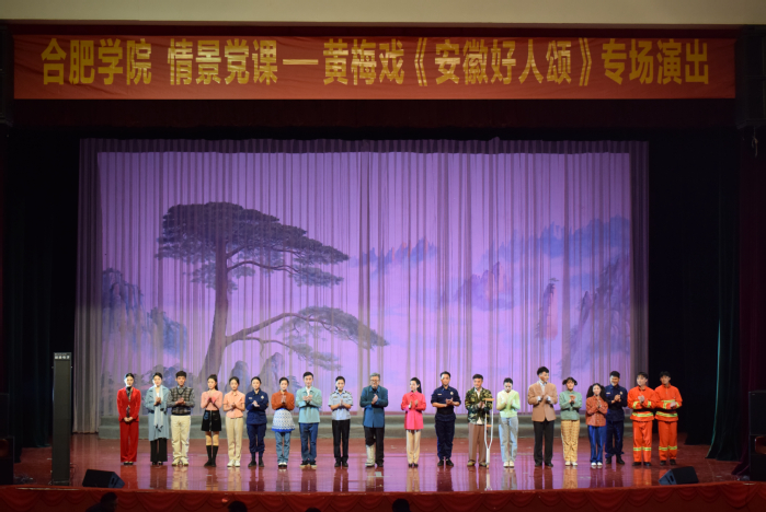 演出現場,黃梅戲演員們用精湛的演技展現了一位位道德模范的光輝事跡:合肥廬江縣消防救援大隊陳陸在執行抗洪搶險救援任務、搜救被困百姓中不幸犧牲;和縣退休教師葉連平打造“留守兒童之家”,助力鄉村教育;固鎮縣王莊鎮張家豐為愛守候,用五百天時間喚醒了植物人女友。伴隨著黃梅戲演員婉轉的唱腔響起,跌宕起伏的情節在舞臺上生動再現,富有感染力的表演與感人的故事深深打動了在場觀眾,贏得了熱烈掌聲。師生們紛紛表示,演出震撼人心、鼓舞人心,下一步要弘揚道德模范高尚品格,培育和踐行崇德向善的道德行為,將從榜樣事跡中汲取到的精神力量,轉化為全面建設現代化美好安徽的實際行動。