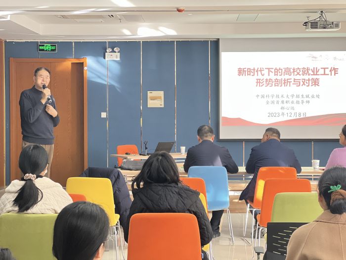 講座中,郝心遠全面分析了目前高校就業現狀及深層原因。他結合中科大畢業生就業數據介紹了中科大的整體就業情況,分析了科大學生求職時的地域偏好、行業偏好等。他結合個人從業經歷分享了高校就業工作的體會與思考。他表示,要引導學生積極響應國家號召,以學生為中心開展就業服務和指導工作。