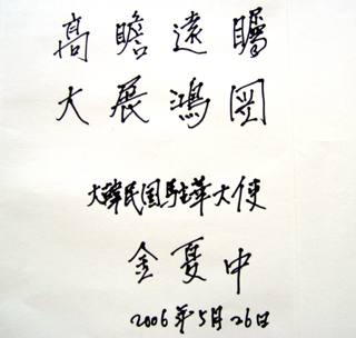 院領(lǐng)導(dǎo)劉立成、蔡敬民、鄭永紅、陳嘯、丁明等首先在主教學(xué)樓2樓會議室親切會見金夏中一行。會見中,副院長蔡敬民教授向金夏中介紹了我院的辦學(xué)情況特別是我院的中韓合作辦學(xué)情況,指出趙誠惠老師為我院對韓合作辦學(xué)作出的積極貢獻(xiàn)。金大使的到來必將推動我院與韓國高校辦學(xué)的進(jìn)一步發(fā)展,也必將對提升我院在中韓合作院校的重要地位產(chǎn)生巨大影響。金夏中大使在會談時(shí)說,合肥學(xué)院是安徽省對外發(fā)展的一個(gè)重要窗口,我很榮幸來貴校訪問并做演講。此次訪問安徽的目的是進(jìn)一步了解安徽,探討雙方合作與發(fā)展的前景與措施。其次是看望老朋友趙誠惠夫婦,感謝她們?yōu)轫n中友誼所做出貢獻(xiàn)。簡短的會談結(jié)束后,金夏中大使為我院題詞:“高瞻遠(yuǎn)矚,大展宏圖”。