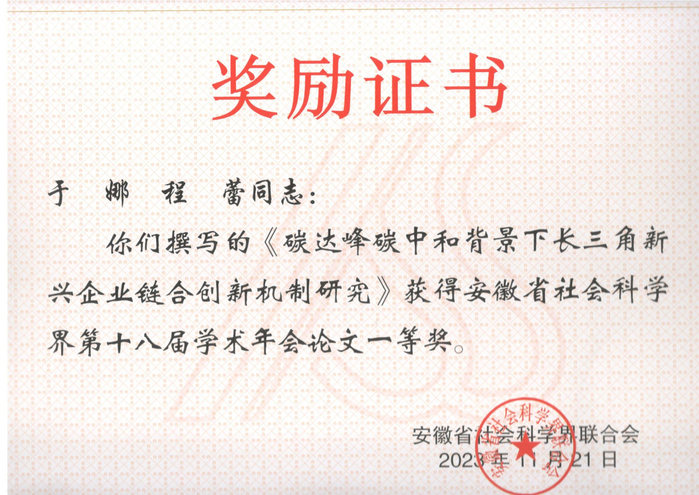 學校獲一等獎1項、三等獎2項、優秀獎1項,其中經濟管理學院于娜、程蕾的《碳達峰碳中和背景下長三角新興企業鏈合創新機制研究》榮獲一等獎,實現了新的突破。獲獎征文彰顯中國特色、時代特征、安徽特點的研究成果,為打造“三地一區”、建設“七個強省”,走出高質量發展新路提出了很多戰略性、前瞻性、操作性強的對策建議。