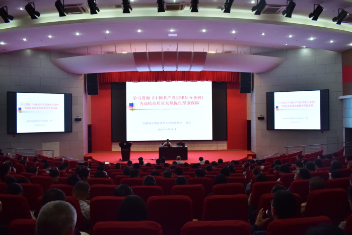 5月31日,校黨委在圖書館學術報告廳A廳召開警示教育大會。省紀委監委第八紀檢監察室三級調研員周平應邀作《學習貫徹<中國共產黨紀律處分條例> 為高校高質量發展提供堅強保障》的專題警示教育輔導報告。校黨委書記王其東,副校長陳秀,黨委委員、副校長白義香出席會議,校黨委委員、紀委書記、省監委駐合肥大學監察專員吳功福主持會議。科級以上領導干部、機關黨委和二級學院黨委委員和紀委委員、各教工黨支部書記、直屬黨支部紀檢委員參加會議。