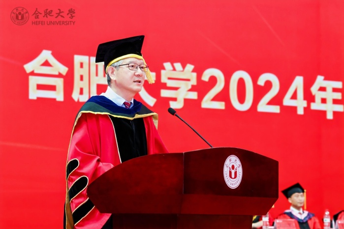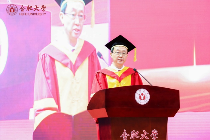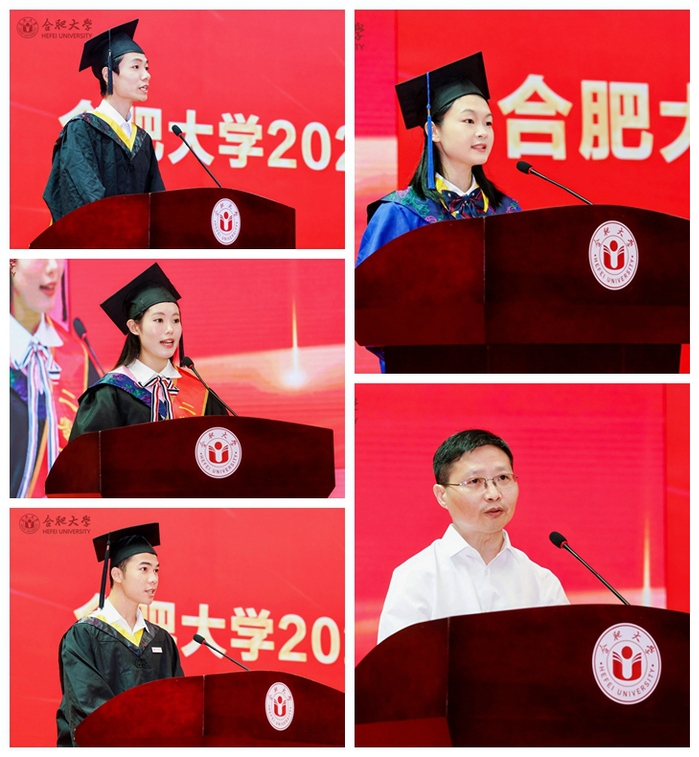 本科生畢業生代表徐桐、研究生畢業生代表詹學娟、留學生畢業生代表蘇陽、“西部計劃”畢業生志愿者代表徐思揚、教師代表孫強教授相繼發言。徐桐表示將不負學校栽培,向下扎根,投身基層,建功西部,在鄉村沃土綻放青春,服務地方,用行動與奮斗為母校增光添彩。詹學娟向母校和老師致以誠摯的感謝,并回憶了自己在校期間的科研和求學經歷,表示未來將努力提升自我,助力經濟社會的發展。蘇陽回顧了中柬長期以來友好往來、深度合作的偉大歷程,對“一帶一路”建設和合肥大學的培養表示感謝。徐思揚講述了個人“三下鄉”實踐經歷,號召廣大學子要用自己的知識和力量去服務人民,推動西部地區的發展。孫強表示,青年學子要堅守初心,不忘使命,始終保持對學習的熱情,做到學而不輟,勇敢面對未來的挑戰和機遇,保持積極昂揚的精神狀態,最終通向理想的彼岸。