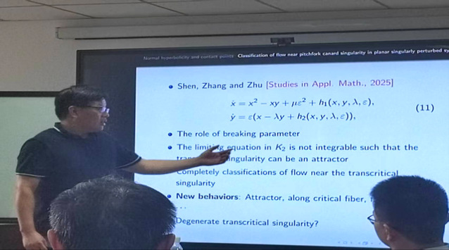三位教授結(jié)合理論推導(dǎo)與實(shí)例分析,細(xì)致講解研究成果與方法。沈建和以豐富的案例和嚴(yán)謹(jǐn)?shù)耐茖?dǎo),系統(tǒng)闡釋接觸點(diǎn)分叉奇異擾動(dòng)的核心問(wèn)題,為學(xué)員搭建起基礎(chǔ)理論框架;