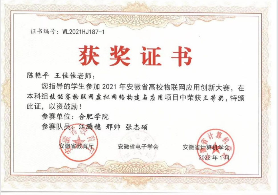 近六年在師生共同努力下,共獲得國際獎項21項、國家級獎項146項、省級獎項480項。主要獎項有:2022中國機器人大賽暨RoboCup機器人世界杯中國賽-仿真2D組冠軍;“華數杯”全國大學生數學建模競賽國家級二等獎一項,三等獎一項,優秀獎六項;第八屆東方財富杯全國大學生金融挑戰賽國家級二等獎一項;安徽省機器人大賽省三等獎四項;安徽省大學生統計建模大賽省級一等獎一項;第八屆安徽省“互聯網+”創新創業大賽省級銀獎;第十屆“挑戰杯·華安證券”安徽省大學生創業計劃競賽銀獎,第十二屆MathorCup高校數學建模挑戰賽二等獎等;獲批大學生創新創業訓練計劃項目國家級97項,省級175項,先后有2人次學生獲得安徽省“創新之星”榮譽稱號。