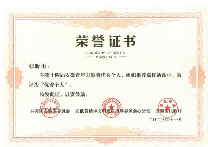 近日,由團省委、省文明辦、省民政廳聯合開展的第十四屆安徽省青年志愿者“優秀組織”“優秀個人名單公布,我校青年志愿者聯合會獲評“安徽省青年志愿者優秀組織”,經濟與管理學院張昕雨同學獲評“安徽省青年志愿者優秀個人”。