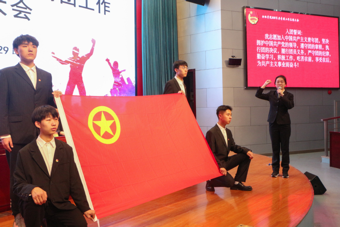 會議伊始,全體起立奏唱國歌。各學院新入團團員代表在老團員代表汪欣楠的帶領下,面對團旗,握拳舉起右手,莊嚴宣誓:“我志愿加入中國共產主義青年團,堅決擁護中國共產黨的領導,遵守團的章程,執行團的決議,履行團員義務,嚴守團的紀律,勤奮學習……”新團員的宣誓慷慨激昂,表達了他們堅定的信念。