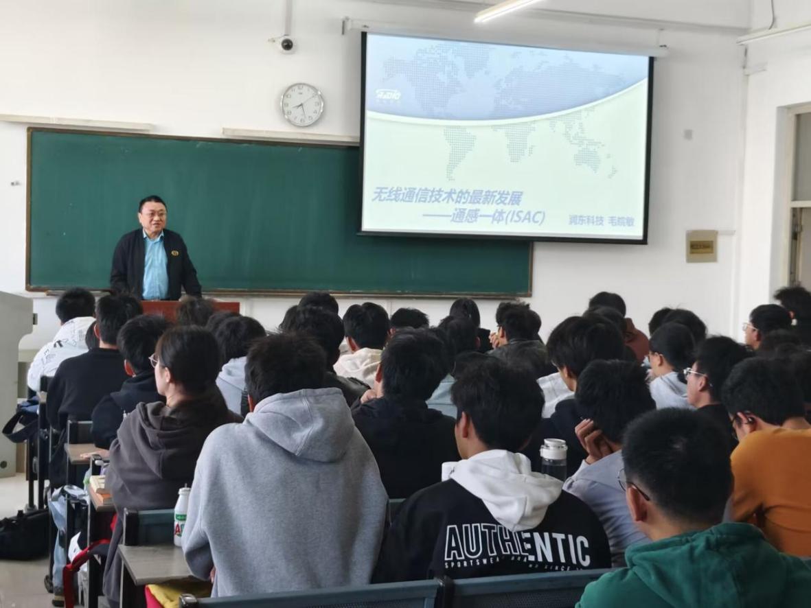 115日,專業邀請了合肥潤東通信科技股份有限公司毛皖敏董事長做了《無線通信技術的最新發展--通感一體(ISAC)》的專題報告。報告伊始,毛皖敏董事長介紹了其企業相關產品,然后,然后報告圍繞通信技術的發展、5G通信的應用場景、通感一體無線通信和6G關鍵技術逐一展開,最后,毛總跟同學們闡述了職業發展的路徑,并對同學們四年的大學活提出了期望。