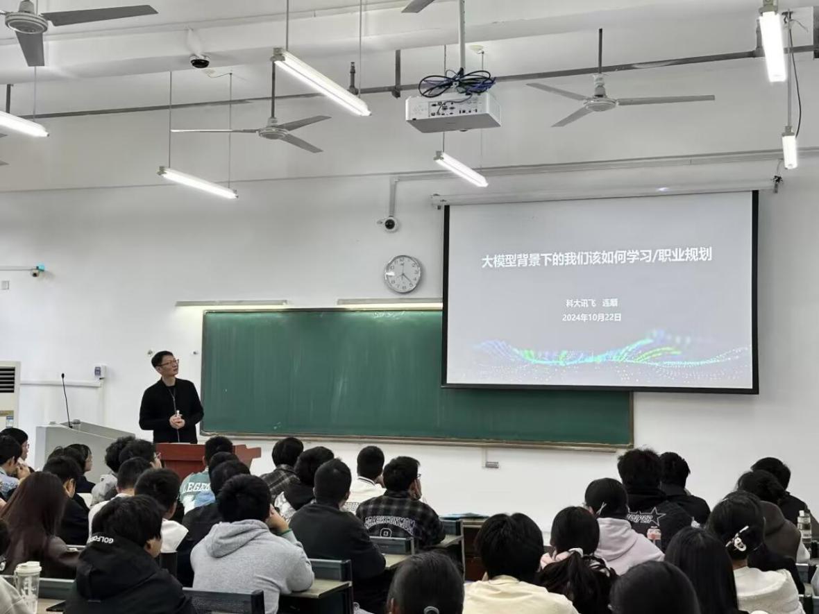 1020日,科大訊飛教育發展有限公司總監連順做了《大模型背景下的我們該如何學習/職業規劃》的專題報告,連總首先對大模型的原理及技術進行了深入淺出的介紹,向學生展示了目前最新AI研究成果,然后介紹了前沿技術發展趨勢及行業應用,最后對在大模型時代下學生四年的規劃提出了寶貴意見。