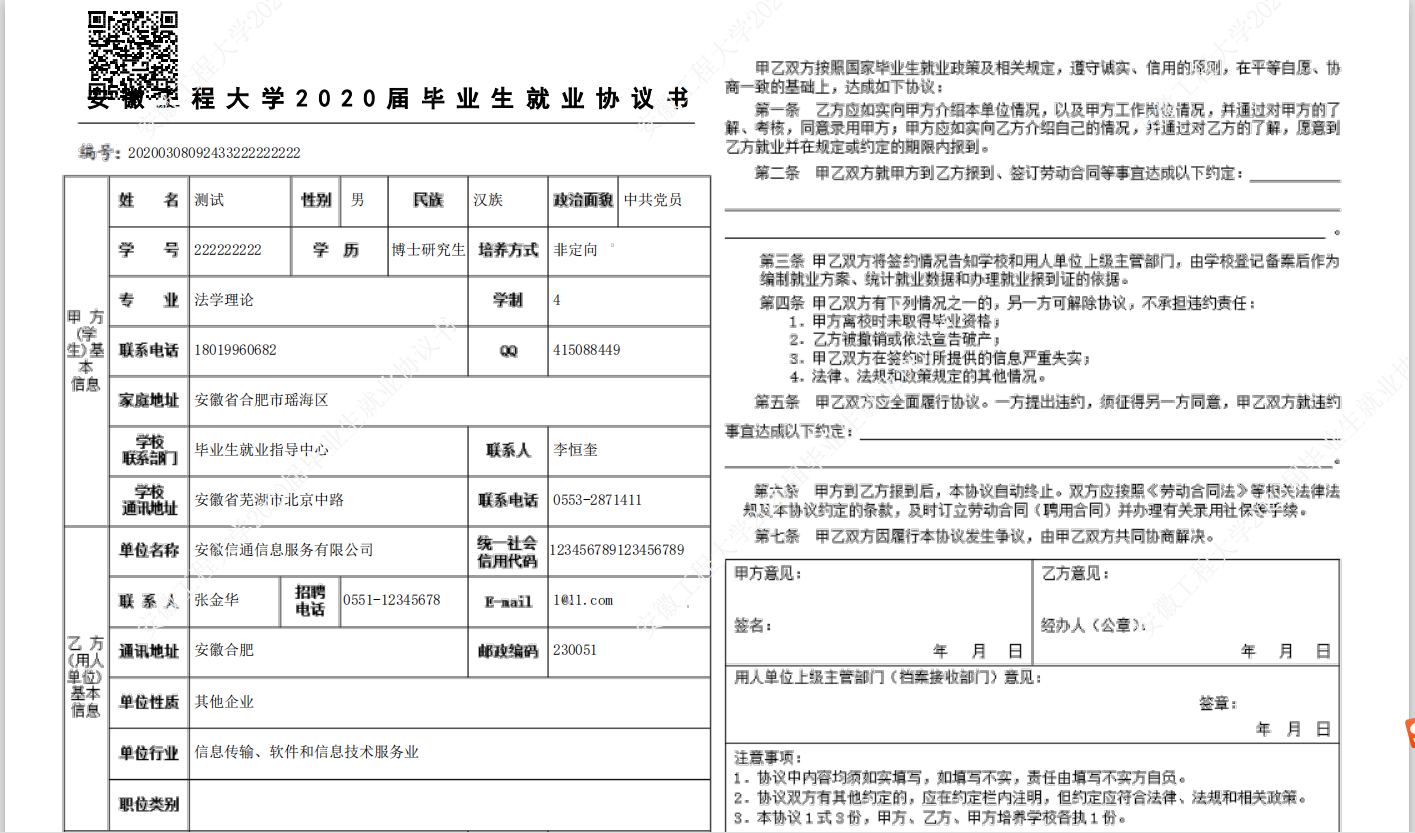 協議書默認打印3份(用人單位1份、畢業生1份、學校1份)。協議書打印完畢后,交給用人單位或畢業生,進行蓋章簽字后生效。(若畢業生在外地,可自行安裝一個PDF打印機,打印成PDF文件,以便進行網上傳輸; 或打印出來后,掃描后傳輸)。