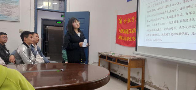 活動第一項,由溫磊、張娟、胡寧路、王琴四位同志對《寫給青少年的黨史》第2.6章至2.9章進行朗讀。通過四位同志的精彩朗讀,我們認識到了隱蔽在暗處,卻挽救共產黨于危難之間的“龍潭三杰”,他們膽大心細、智勇雙全,雖隱姓埋名,卻于無形處建奇功;了解了中央紅軍被迫撤離蘇區背后的兇險與艱難,內有博古、李德等人的左傾教條主義思想,外有國民黨數百萬軍隊的圍追堵截,但實踐出真知,一系列的挫折也確定了毛澤東等的正確領導;探尋了遵義會議這一生死攸關的轉折點:如果沒有這次會議的召開,黨和紅軍就不可能從困境中走出來;體會了漫漫長征路的苦難與曲折,無數長征戰士用鮮血將長征之路染成了一條“地球的紅飄帶”。歷史從未被遺忘,百年征程,波瀾壯闊,是流血與犧牲換來了如今的和平年代。通信學生黨支部必將不忘初心,砥礪前行,讓長征精神流芳百世,并且時刻銘記在每個人的心中!