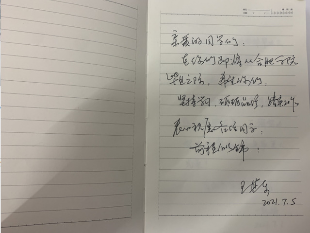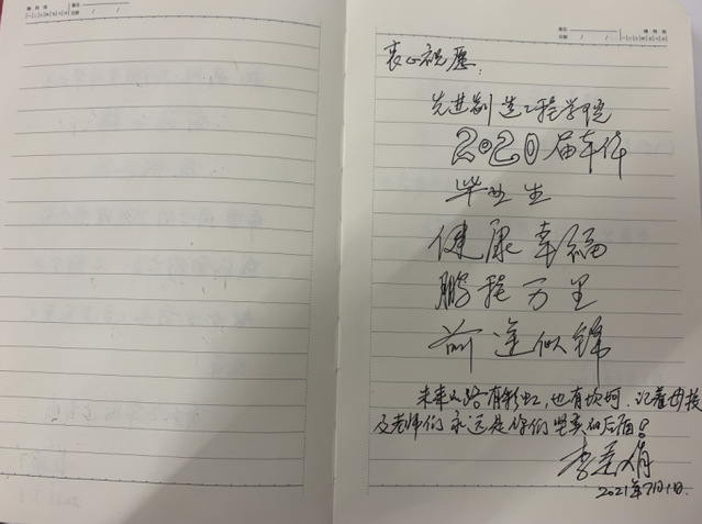 最后,王其東指出,希望先進制造工程學院黨委和智能制造學生黨支部能夠繼續做好黨史教育以及畢業生相關工作,提升支部建設水平,發揮好黨員模范帶頭作用,并為先進制造工程學院全體畢業生書寫畢業寄語,讓其堅持學習、踏實工作,砥礪前行。院黨委書記杜娟和黨委副書記李秀娟也同時為畢業生寄語,愿大家努力工作,堅守信念。