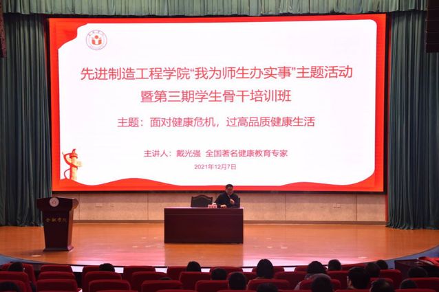 為結合黨史學習主題教育,深化“我為師生辦實事”主題活動開展,幫助師生養成良好健康生活習慣,樹立正確生活理念,127日下午,先進制造工程學院在圖書館報告廳舉辦“我為師生辦實事”主題活動,邀請全國著名健康教育專家戴光強教授來我校作健康知識專題講座,本次講座以“面對健康危機,過高品質健康生活”為主題,先進制造工程學院全體教職工和學院學生骨干培訓班全體學員聆聽講座。講座由先進制造工程學院黨委書記杜娟主持。