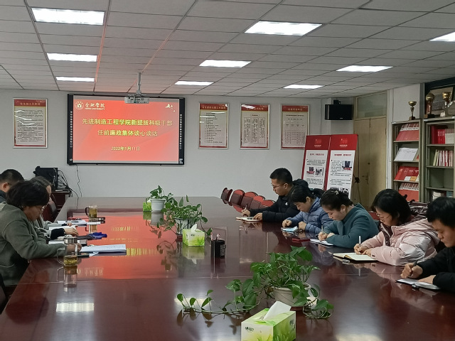 為加強黨內監督和干部教育,增強新任領導干部廉潔履職和自律意識,根據《合肥學院科級干部選拔任用工作實施辦法(試行)》和學校關于落實黨風廉政建設黨委主體責任和紀委監督責任的要求,111日下午,先進制造工程學院在38棟會議室召開科級干部任前集體廉政談話,院黨委書記杜娟、院長呂剛、黨委副書記李秀娟出席了會議,對新任科級干部作廉政談話,同時提出明確要求。