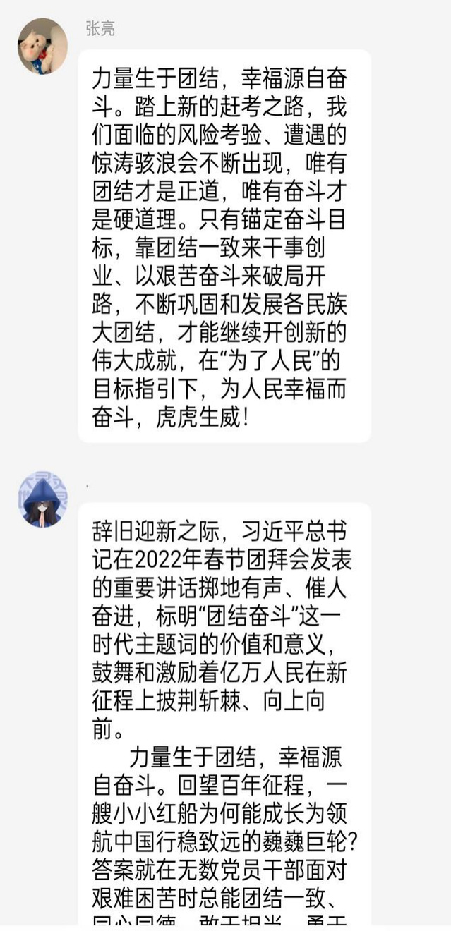 新添歲月,春滿山河,枝葉關情。“世界上最大的幸福莫過于為人民幸福而奮斗”,習近平總書記在2022年春節團拜會上的講話中再次標定“人民幸福”的新高度。為了更深刻的了解、理解習近平總書記在春節團拜會上的講話。通信學生黨支部于2022年2月5日晚,以黨小組為單位,進行線上觀看學習習近平新年致辭,支部全體黨員、預備黨員及入黨積極分子參加本次活動。