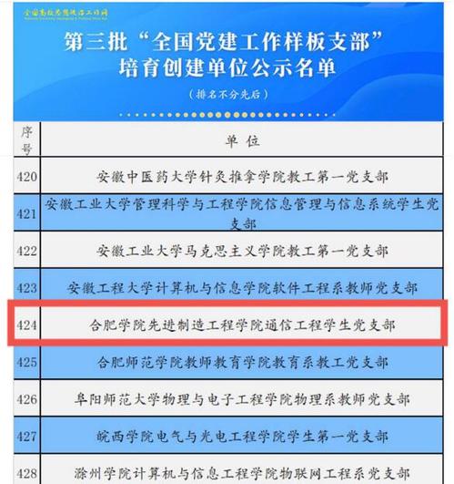 近日,教育部思想政治工作司公布關于第三批新時代高校黨建示范創建和質量創優工作評審結果,此次遴選共產生了11個全國黨建工作示范高校、100個全國黨建工作標桿院系、1000個全國黨建工作樣板支部培育創建單位。我院通信工程學生黨支部成功入選第三批“全國黨建工作樣板支部”培育創建單位。