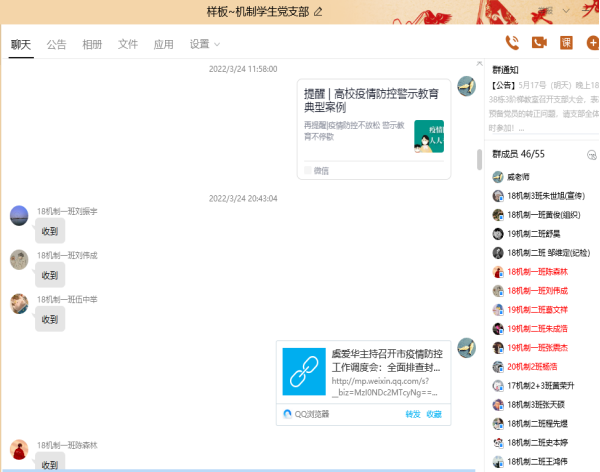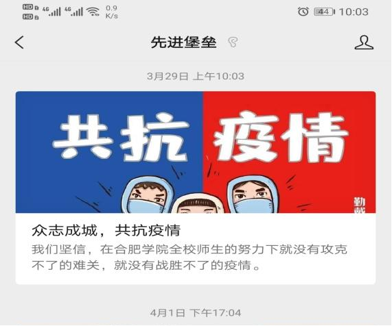 黨旗在肩,戰“疫”必勝。機制學生學生黨支部把黨建工作與抗擊疫情緊密聯系,把聚焦打贏疫情防控阻擊戰作為當前工作的首要任務,組織學習《中共合肥市委組織部關于在疫情防控中充分發揮基層黨組織戰斗堡壘作用和黨員先鋒模范作用的通知》和習近平總書記在中共中央政治局常務委員會會議上關于從嚴抓好疫情防控工作的重要講話精神推動黨員沖在一線,干在實處,奮勇爭先。