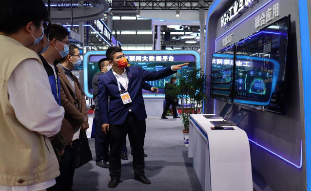 圖為調研成員正在參觀世界制造業大會的“5G+工業互聯網成果展”