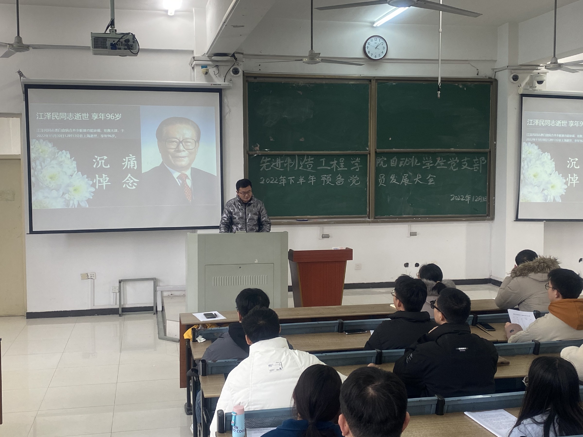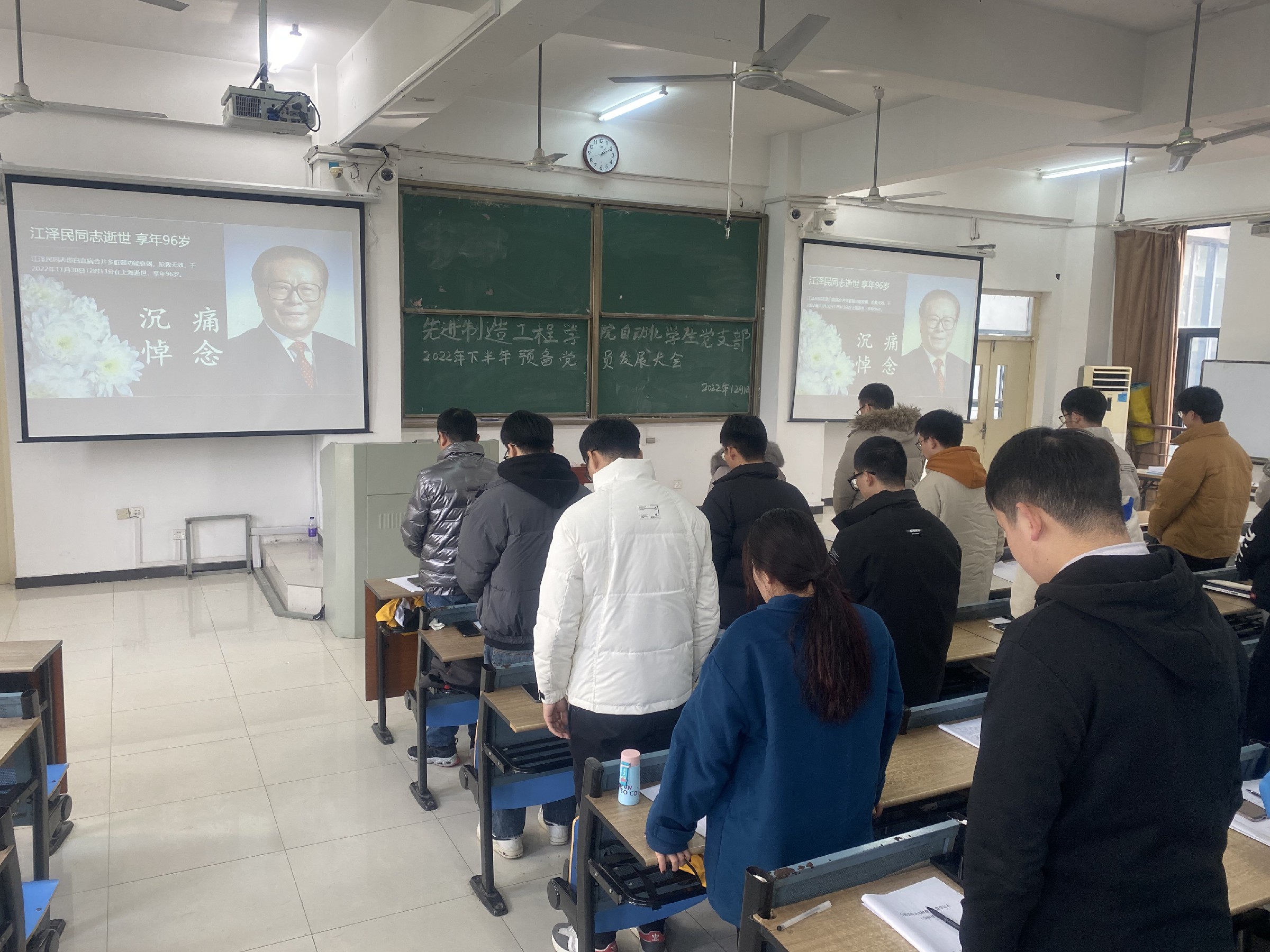 中國特色社會主義偉大事業的杰出領導者、黨的第三代中央領導集體的核心江澤民同志患白血病合并多臟器功能衰竭,搶救無效,于202211301213分在上海逝世,享年96歲。支部書記梅志強老師帶領全黨支部成員進行3分鐘默哀,表達對江澤民同志的哀悼。