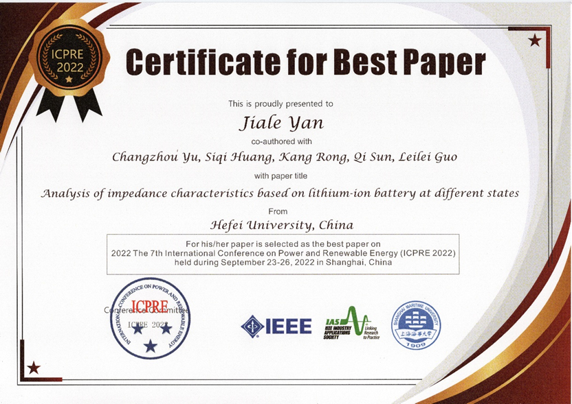 2022923-26日,第七屆動力與可再生能源國際會議(The 7th International Conference on Power and Renewable Energy, ICPRE 2022在中國上海舉行(由于疫情影響,會議以線上線下相結合的模式舉辦)。先進制造工程學院余暢舟副教授指導的2020級碩士研究生閆佳樂線上參與本次會議,其論文《Analysis of Impedance Characteristics Based on Lithium-ion Battery at Different States》榮獲最佳論文獎(Best Paper Award)