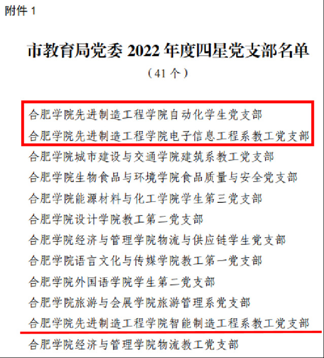 近日,中共合肥市教育局委員會下發了《關于公布2022年度四星、五星黨支部驗收審定結果的通知》(合教黨委〔2023〕12號),先進制造工程學院3個黨支部被評為五星級黨支部、3個黨支部被評定為四星級黨支部。