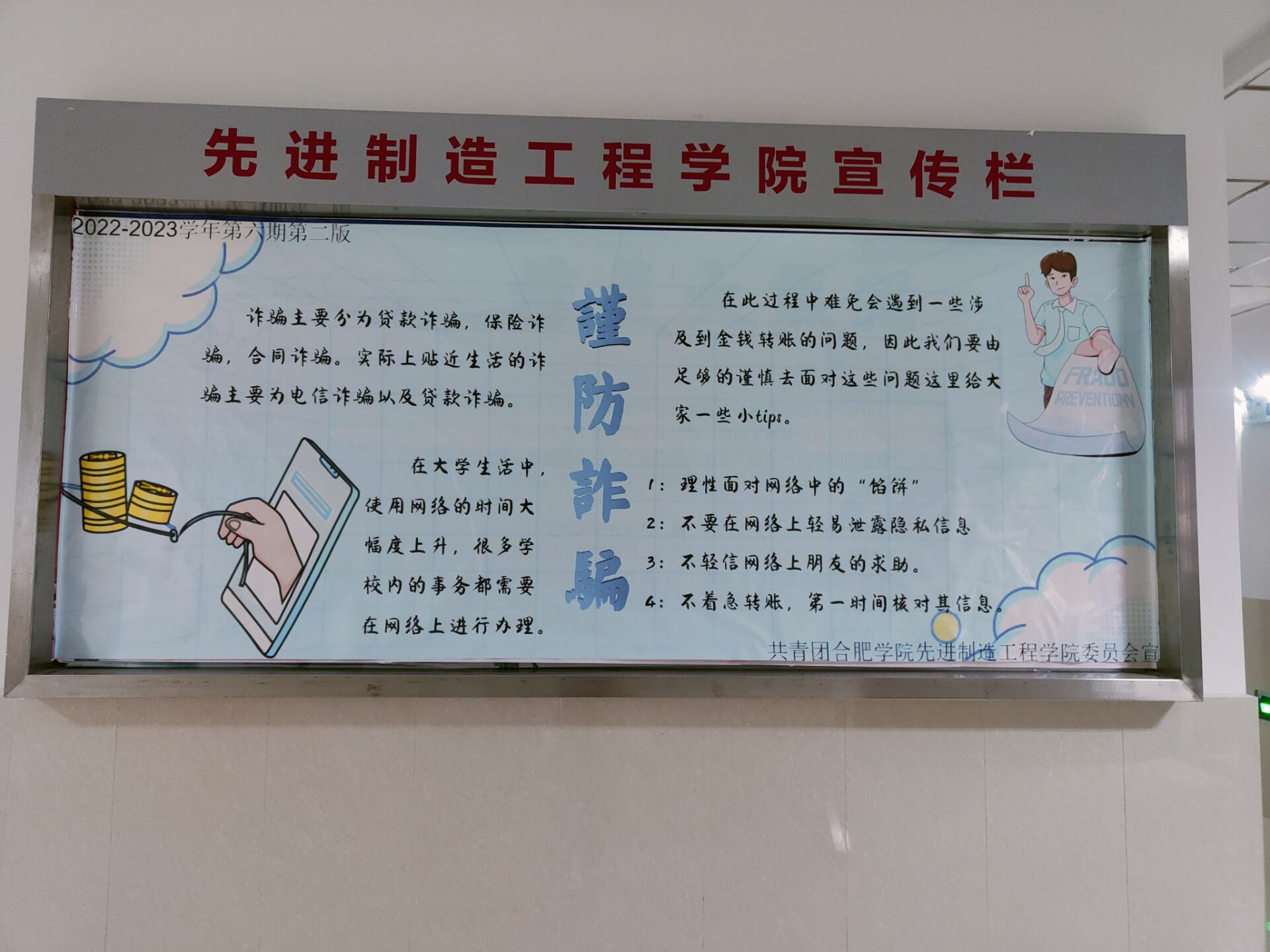 大學面向的受眾主要是大學生,在大學校園中宣傳欄教育是教育的重要載體。我院通過團委的宣傳欄開展防范詐騙教育。簡要介紹了詐騙的基本類型重點介紹網絡詐騙防范和提出四點防范建議