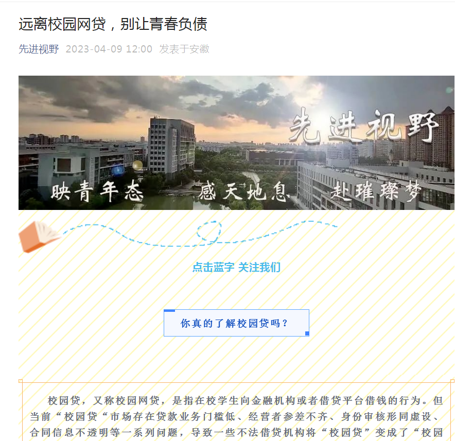 高校官方微信公眾平臺是高校全媒體矩陣中的重要組成部分,是高校對外宣傳的重要窗口,也是高校品牌和形象塑造的重要平臺。我院通過先進視野公眾號發布專題文章“遠離校園網貸,別讓青春負債”,圍繞校園貸的定義、特點、危害、案例、防范等方面開展教育。全篇文章以圖文并茂的形式向學生進行宣傳教育獲得了學生的喜愛。