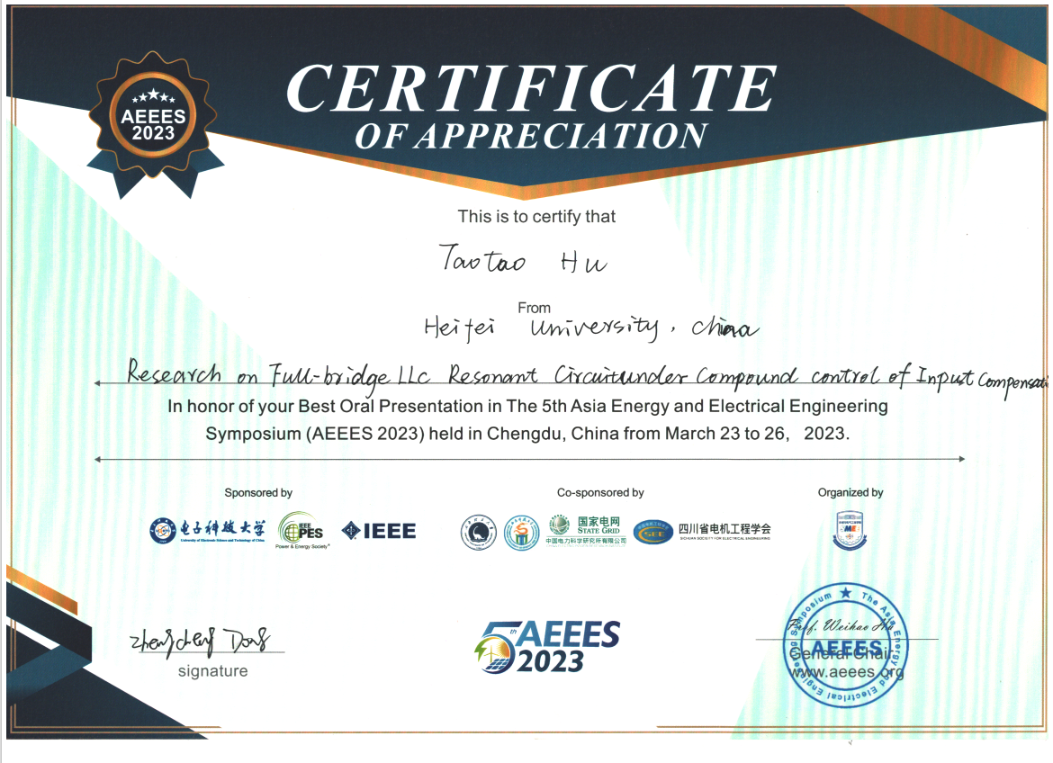 2023323-26日,第五屆亞洲能源與電氣工程國際會議(The 5th Asia Energy and Electrical Engineering Symposium, AEEES 2023在中國成都舉行。先進制造工程學院徐海珍副教授指導的2020級碩士研究生胡濤濤參與了本次會議,并在現代電力電子與傳動專題分會中進行了《Research on Full-bridge LLC Resonant Circuit under Compound control of Input Compensation》口頭報告,榮獲最佳口頭報告獎(Best Oral Presentation)
