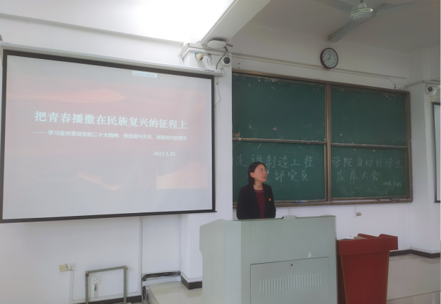 為更好學(xué)習(xí)貫徹黨的二十大精神,推進(jìn)學(xué)習(xí)貫徹習(xí)近平新時(shí)代中國(guó)特色社會(huì)主義思想主題教育,教育引導(dǎo)大學(xué)生擔(dān)當(dāng)復(fù)興大任,做新時(shí)代好青年,2023年5月23日中午,先進(jìn)制造工程學(xué)院黨委副書記蔡靈美老師為在我校38棟3階梯教室為自動(dòng)化學(xué)生黨支部講授了題為“把青春播撒在民族復(fù)興的征程上”的黨課。支部全體成員聆聽了黨課。
