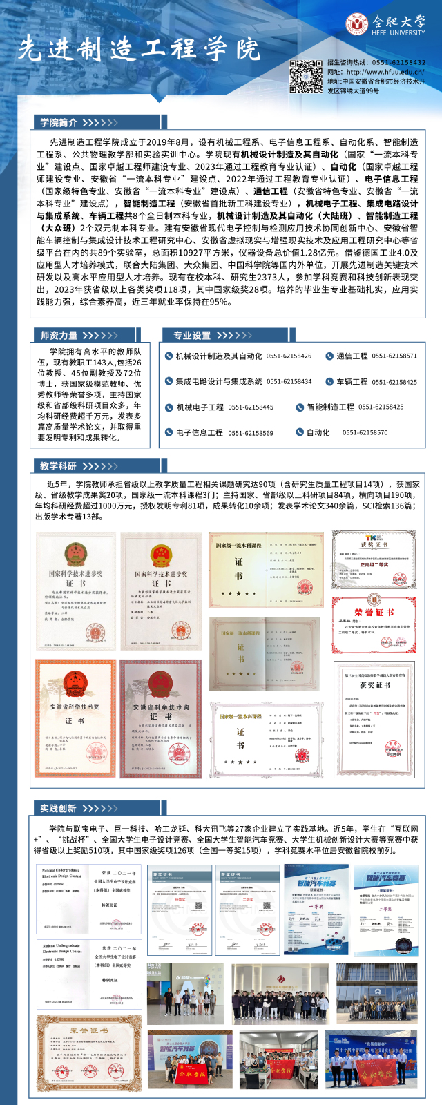 先進制造工程學院成立于2019年8月,設有機械工程系、電子信息工程系、自動化系、智能制造工程系、公共物理教學部和實驗實訓中心。現有教職工143人,教授25人,具有博士學位72人,擁有國家級模范教師、優秀教師職業教育杰出教師多名。學院現有電子信息、機械兩個專業碩士學位授權點,設有機械設計制造及其自動化(國家首批國家級一流專業建設點)、機械設計制造及其自動化“雙元制”(國家首個新工科雙元制建設專業)、機械電子工程、智能制造工程,車輛工程,電子信息工程(國家級特色專業),自動化(國家卓越工程師教育培養計劃專業),通信工程、集成電路設計與集成系統9個本科專業。建有現代電子控制與檢測應用技術協同創新中心、安徽省智能車輛控制與集成設計技術工程研究中心、虛擬現實與增強現實(AR/VR)應用技術級實驗平臺在內的共89個實驗室,總面積超1萬平方米。借鑒德國工業4.0及應用型人才培養模式,聯合大陸集團、德國大眾汽車集團、中國科學院等國內外單位,開展先進制造關鍵技術研發以及高水平應用型人才培養。現有在校本科、研究生2447人參加學科競賽和科技創新表現突出,2022年獲省級以上各類獎項115項,其中國家級獎32項。培養的畢業生專業基礎扎實,應用實踐能力強,綜合素養高,近三年就業率保持在95%以上。