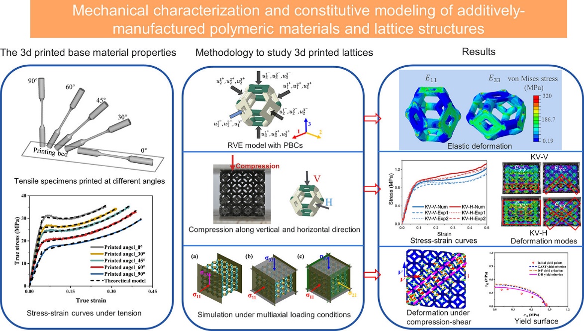 該研究工作分析了3D打印方向對聚合物晶格基體力學性能的影響,提出了耦合打印角度的晶格基體本構模型;構建了晶格周期性單胞及多胞數值仿真模型,實驗與仿真分析指出了晶格結構的宏觀各向異性;進一步研究了Kelvin及簡單立方/體心立方混合兩種典型晶格結構的多軸宏觀本構模型。該研究成果系統而深入地對增材制造晶格結構進行力學表征,進而能有效促進晶格結構的實際工程應用。該項工作得到了新加坡教育部學術研究基金一級資助項目、安徽省高校科研重點項目的資助。