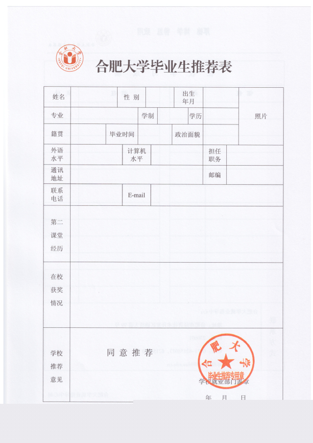 合肥大學(xué)畢業(yè)生推薦表