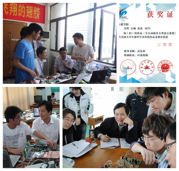 說起自己學生的成績,高先和便滔滔不絕,沒有什么比看到學生們在一次次競賽中斬金奪銀更加驕傲自豪的事。2009、2013年獲得全國大學生電子競賽一等獎,省內一等獎占比排在前列。在這些作品中,不乏被新華網、新安晚報等多家媒體爭相報導的智能創新成果,如“硬幣清點系統”利用傳感器技術、根據硬幣的材料不同判斷其真假并進行分類,降低了許多假幣損失,為公交車和銀行省了不少麻煩,有很好的市場前景。“智能超市”使結賬只需要幾秒鐘;“聰明座椅”讓學生徹底告別早起占座。如今,高先和將團隊工作室搬到同學們的研究地,讓同學們參與產品設計的全過程,熟悉研發的必要科學環境。2013級電子信息工程系電協會長汪程同學表示,老師們的項目經驗讓自己在參加學科競賽少走了不少彎路。因為高老師白天有教學任務,所以經常凌晨三點多,這里還是燈火通明,師生們還在互相交流、修改完善項目。