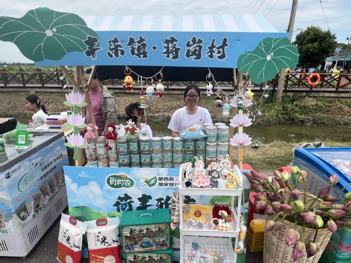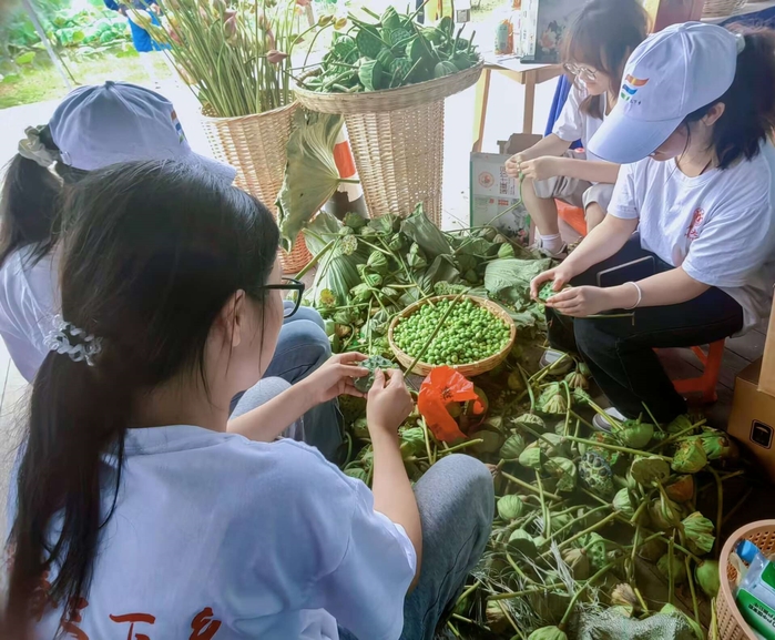 7月6日,“城韻建諧,暑夢新坊”實踐團隊前往豐樂鎮蔣崗村萬畝荷塘基地,與當地農戶一起體驗了蓮子手工制作方法,下蓮塘、摘蓮蓬、剝蓮子,了解養殖荷花的銷售渠道與經銷方式。團隊成員結合實際情況給萬畝荷花池烏篷船水渠改造和文化展館建設提供設計方案,并表示可以搭建相關銷售平臺幫助宣傳和推廣荷花系列產品,用電商平臺賦能鄉村振興高質量發展。