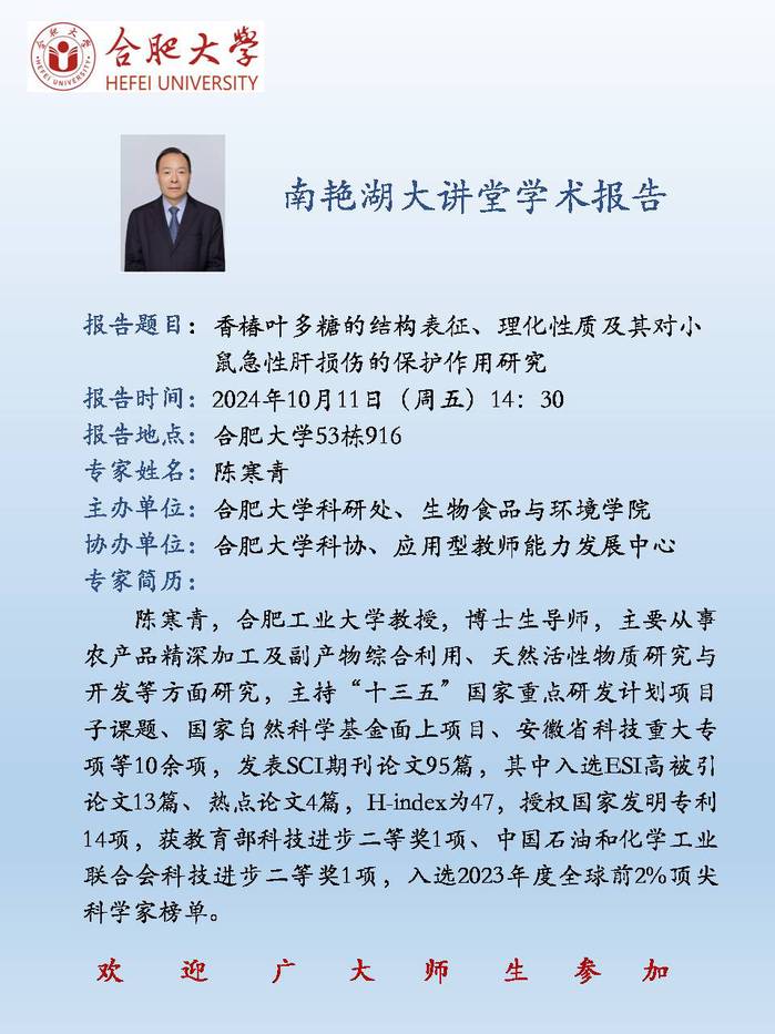 【南艷湖大講堂】香椿葉多糖的結構表征、理化性質及其對小鼠急性肝損傷的保護作用研究